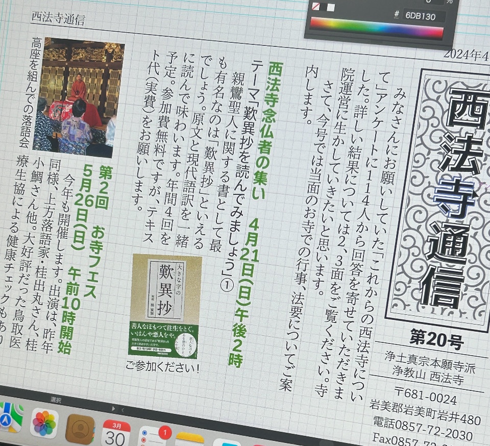 お勤めの際にご門徒さんが、「膝が痛くて医者に行ったら、正座をしないようにと言われて。毎日正座をして仏さんを拝んどったけえ、椅子にしたんだけど、そしたら、なんだあ仏さんより自分の方が高くなってしまって」「新しいものは、背丈が高いだけえ、椅子で拝んでもちょうどええけえ」