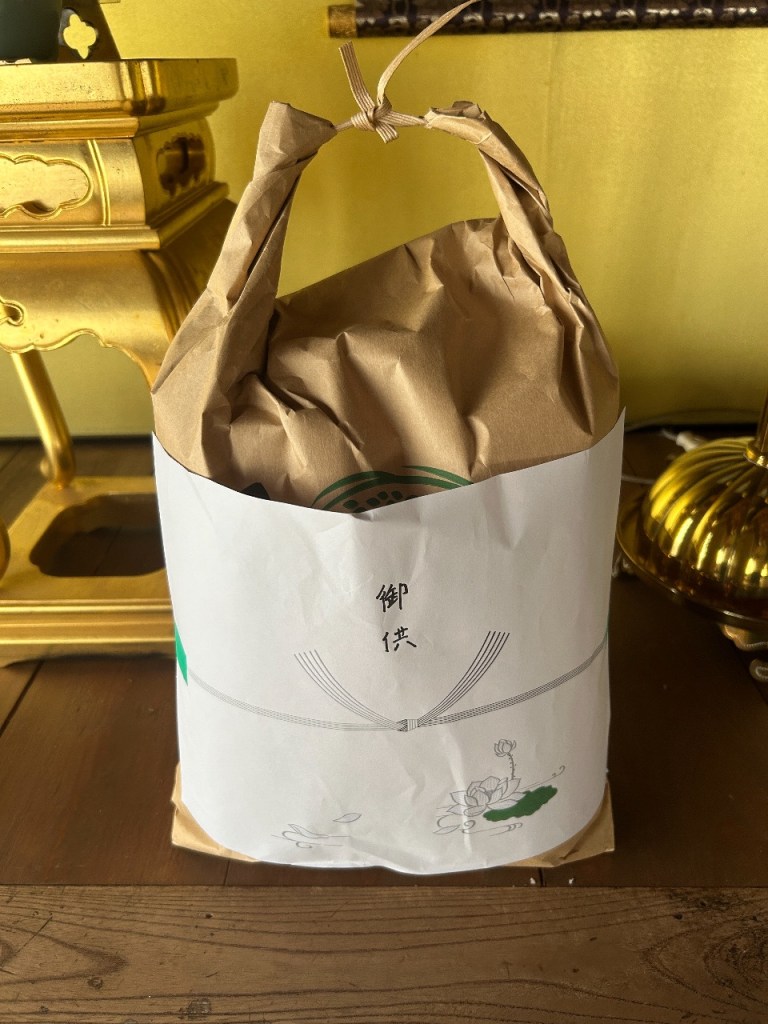 施主さんのごきょうだいのひとりは富山にお住まいです。旦那さんとともに車で6時間かけてこられました。田んぼでとれたお米のお供えをもって。