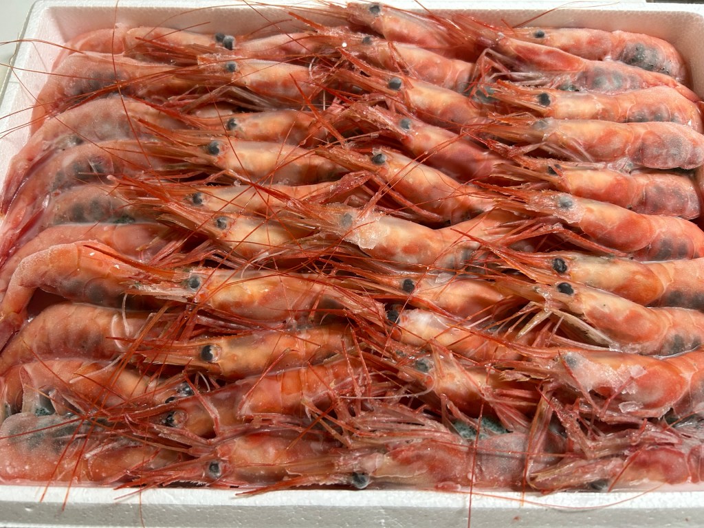 「船内急速冷凍 日本海のえび JF鳥取県漁協」とあります。フタをあけると中にはぎっしりと甘えびが。お刺身や唐揚げなどおいしくいただけます。