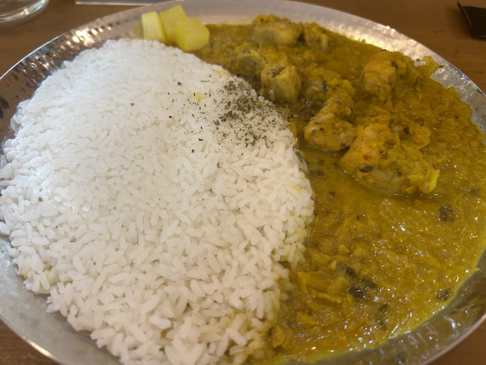 うーん、うまい。病院がえりだからなのか、いつもよりうまい。オレはカレーのなかで、間違いなくここがいちばん自分に合っていると思うのだ。このプリンセスかおりというコメ、炊飯器ではなく鍋で炊くのだという。サラサラしていて、スパイスカレーのために生まれてきたのではないかと思うほどだ。脇役ではなく主役の存在感だ。付け合わせの漬物は名脇役だ。