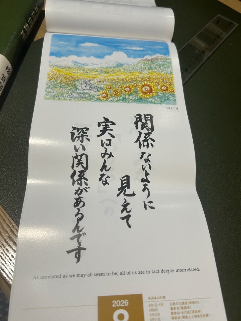 西法寺通信と来年の法語カレンダーをほぼ、配り切りました(と思います)。配っていただいた世話役のみなさんありがとうございました。手元に残ったカレンダーは10冊ほど。あと何冊かはお渡しするとして、お寺の分は年が明けるまで保管です。1週間ほど前、町内を配って歩いていた時、「毎年何が書かれているか、楽しみにしているんです」とある御門徒さんがおっしゃいました。そういう方は少なくないと思います。
