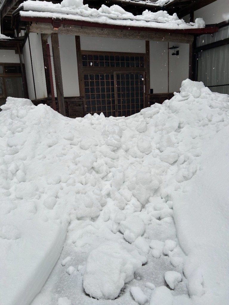 昨日の夜の積雪は数センチ。今日は雪かきをしなくても済みそうとホッとしていたのですが、朝、お寺の玄関前に、屋根から落ちた雪がドーン。