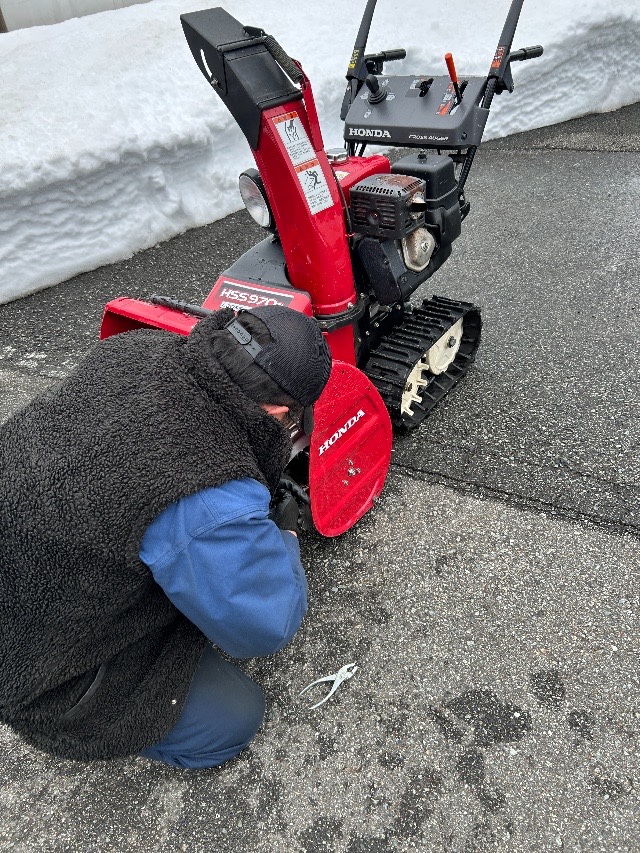 最近、出番が多い十方号に異変が! オーガがうまく回転しなくなったのです。私には手に負えず、市内の業者さんにSOS。午後、修理に来ていただきました。原因はオーガが曲がったことにありました。昨日の雪かきの際、道の穴をふさぐために置かれた鉄板とオーガがあたり、曲がってしまったようです。それにより、本来ならあたらない部分にオーガの先端があたって引っかかるような格好になっていました。
