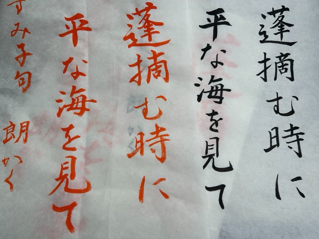 午後は網代の習字教室へ。一昨日もサロンでお会いしたMさんの句集を書いています。「何を摘むと書いてあるんだろ?」と私は「蓬」という漢字が読めませんでした。「ホウ」以外の読み方を知らなかったのです。勉強になります。みなさん、なんと読むかご存知ですか?