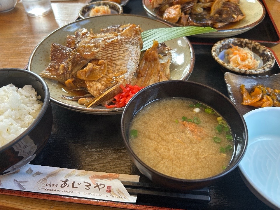 法事に先立ち、前住職夫妻と叔母と5人でランチに出かけました。東京暮らしの叔母には岩美らしいものをと遊覧船乗り場の食堂に行きました。本日のおすすめだったあら煮定食は、食べきれるかが心配になるほどのボリュームで、皆から感嘆の声があがりました。
