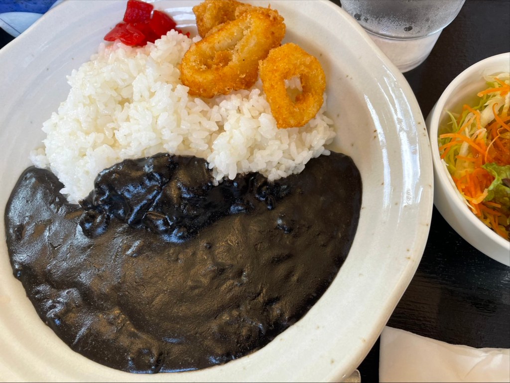 私と前住職が食べたイカ墨カレーは、真っ黒なルーの中にもイカの身が入っていて、味わいがありました。