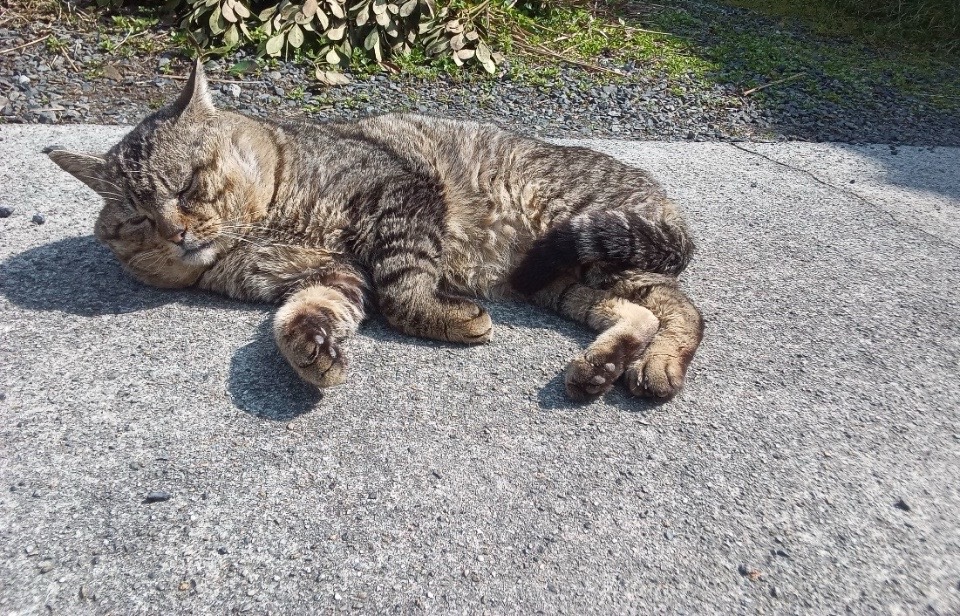 さて、お寺に帰りましょう。我が古家の玄関先ではシマちゃんが日差しを浴びて寝転がり、私の耳にはウグイスの鳴き声。野にはつくしが顔を出し、畑では水仙が満開です。