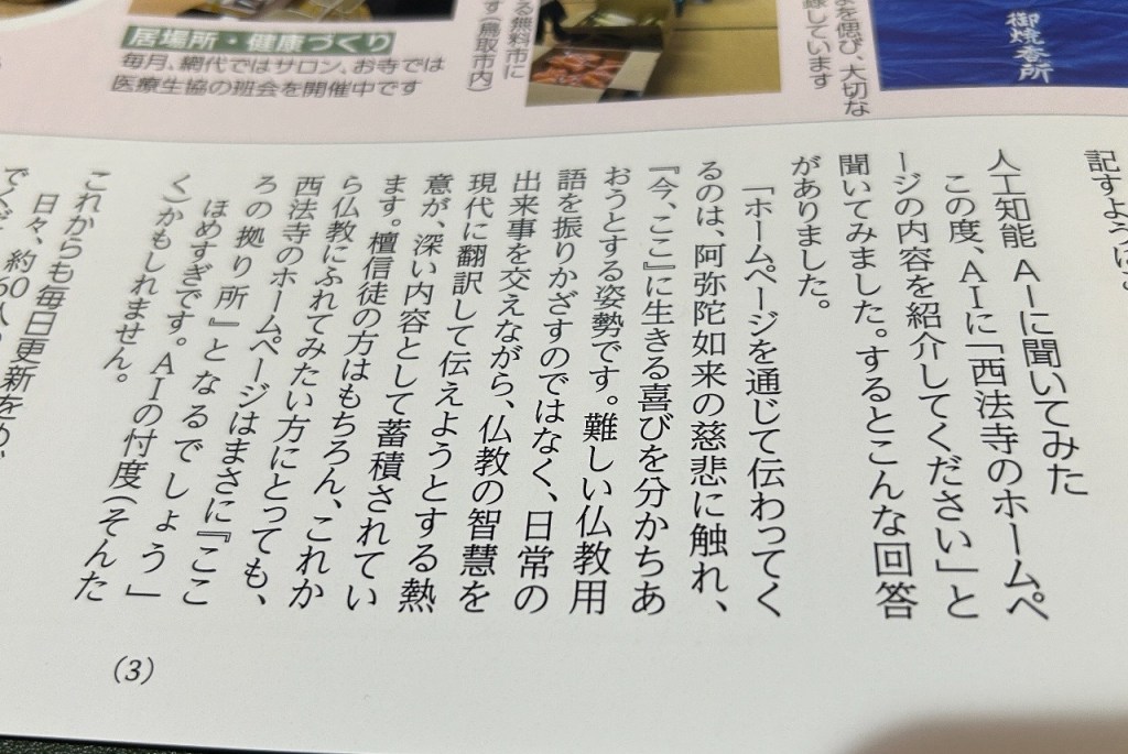 愛読している「月刊住職」に、人工知能AIを活用している僧侶のみなさんの経験談が紹介されていました。私も書いた原稿の推敲をしてもらうことがあります。この度のホームページ特集にあたってAIに、「西法寺のホームページの内容を紹介してください」と質問したところ、こんな回答がありました。