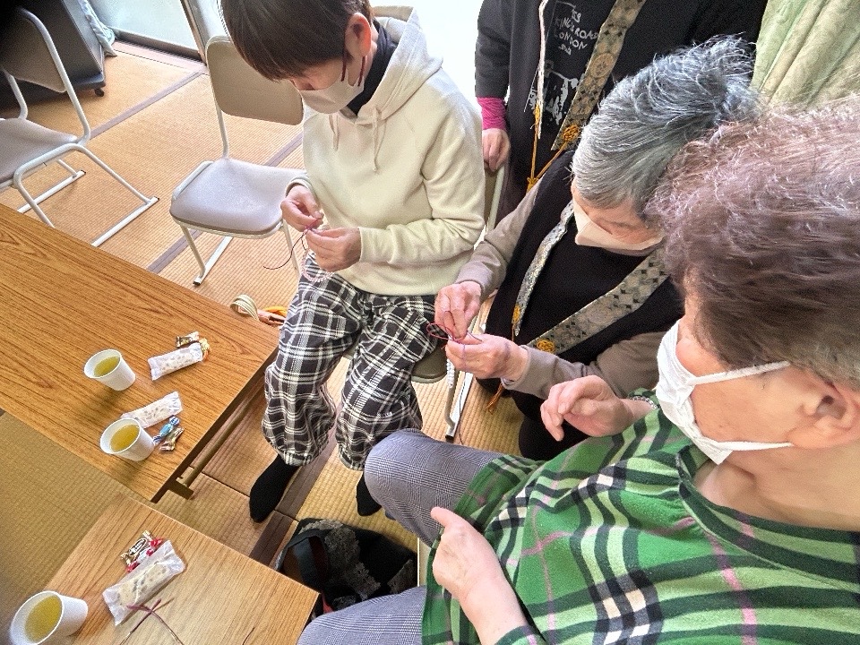 お勤めのあと、休憩もそこそこに念珠編みを再開。大変なもりあがりで、道場は熱気に包まれました。お茶やお菓子を口にすることもみなさん忘れて作業に没頭です。