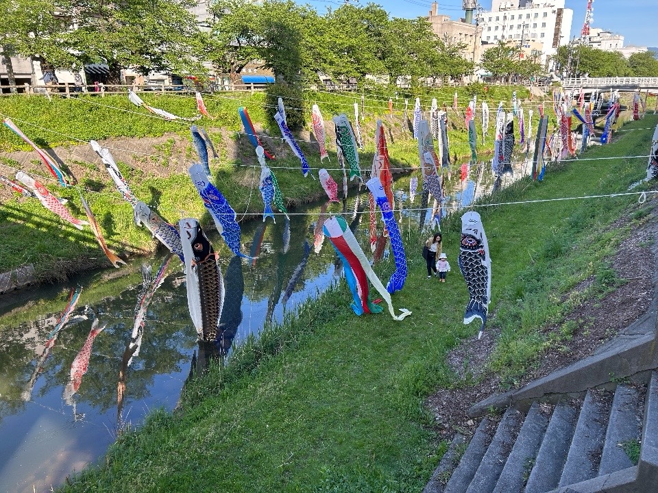 会議は2時間ほどで終了。帰りがけ少し歩くと、お寺の前を流れる袋川にたくさんの鯉のぼりが。