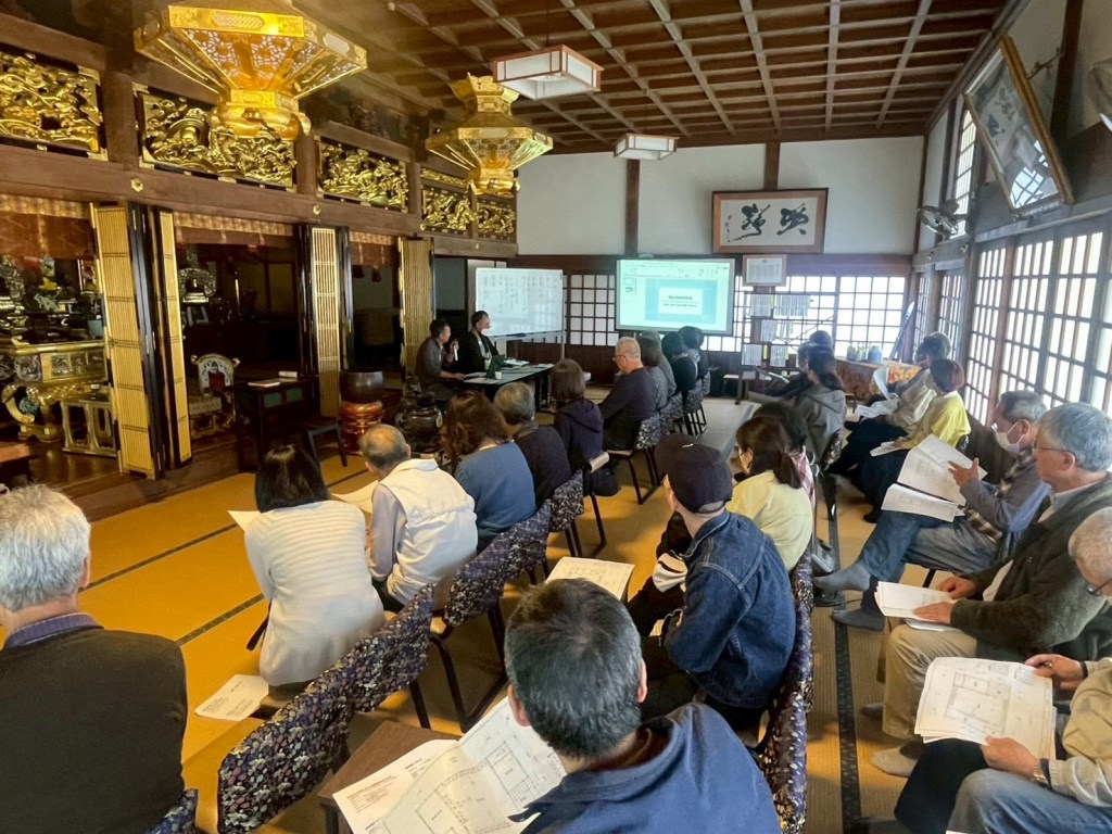 ついで建物と納骨堂に納める納骨檀づくりにたずさわっていただくシャローム建築さんより説明がありました。図面と共に3Dソフトを使って、納骨堂のイメージをわかりやすく示していただきました。「既製品ではないオーダーメイドの納骨堂、納骨壇をつくりたい」との説明を心強く、ありがたく聞かせていただきました。