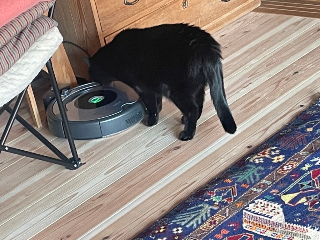 柚子の実を収穫しながら、和歌山の実家払い下げのロボット掃除機を、稼働させてみました。あちこち徘徊しながらゴミを取り込んでいきます。広いばかりのお寺や、家財がきわめて少ない我々の古家には、合っているかもしれません。猫たちが怖がって大騒ぎをするかと思いきや、ター坊以外は隣の部屋に避難。ター坊は掃除機が自走していた1時間たっぷり監視活動をし、バッテリー切れで充電ドッグに戻って静かになると、鼻先で「謎の物体」をつついてみるのでした。ター坊が慣れれば、他の猫たちも慣れるでしょう。