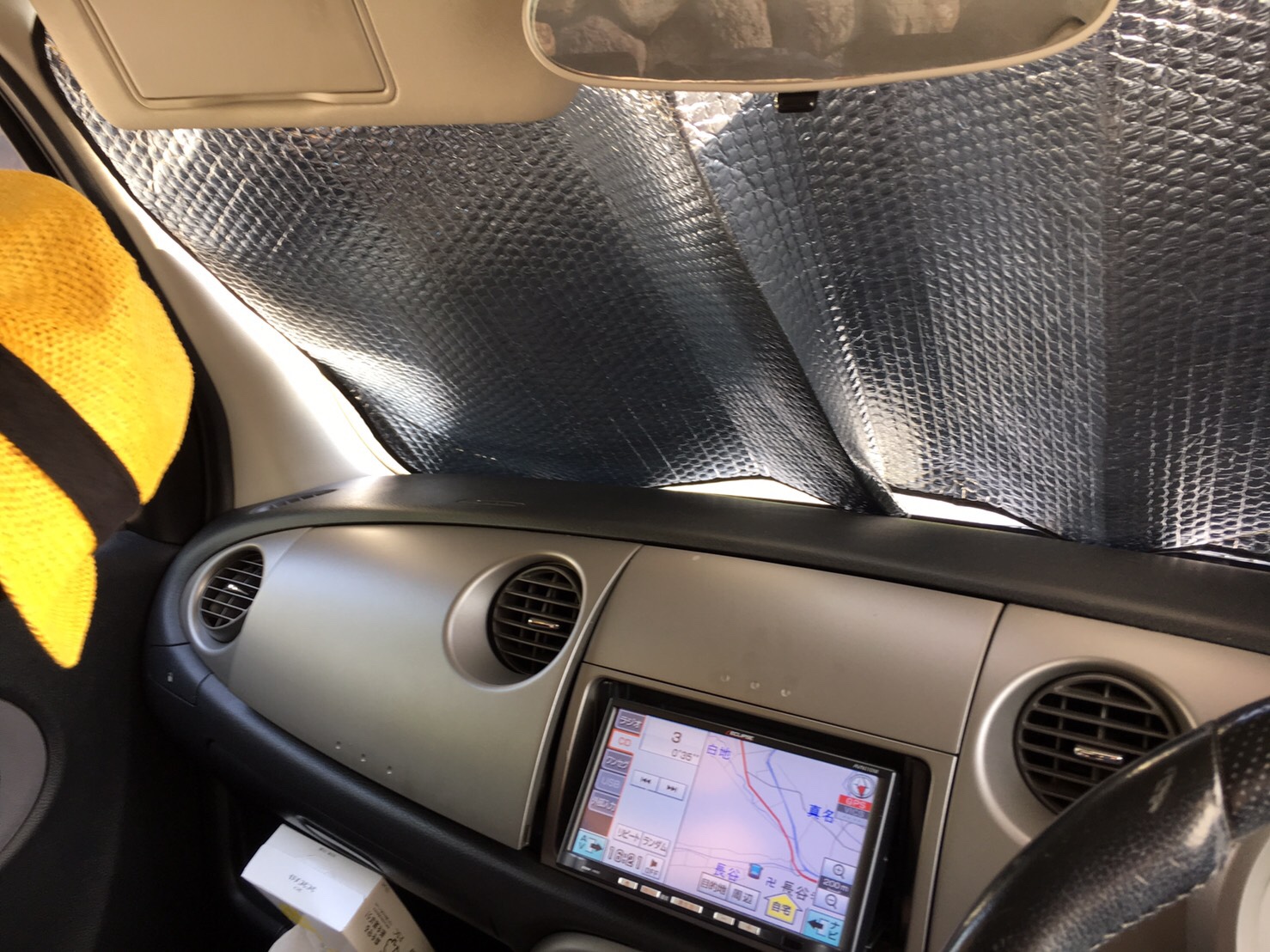 サンシェードをフロントグラスに、サイドの窓には手ぬぐいをはさんで簡易カーテンとし、運転手の熱中症予防といたします。