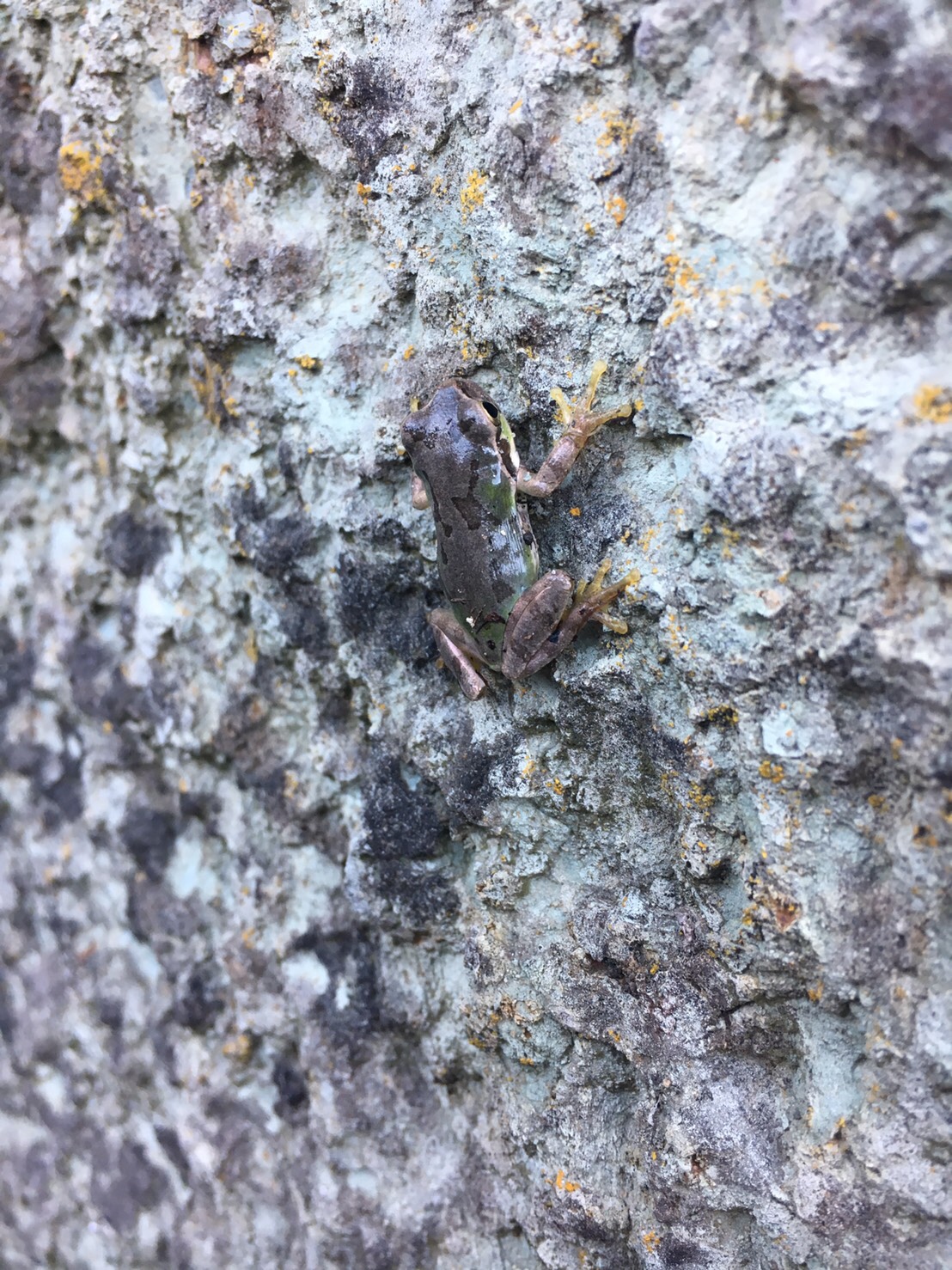 本堂の壁にへばりついたカエルの擬態。ふだんは緑色なのに、なぜこんなに見事に化けるのか不思議です。