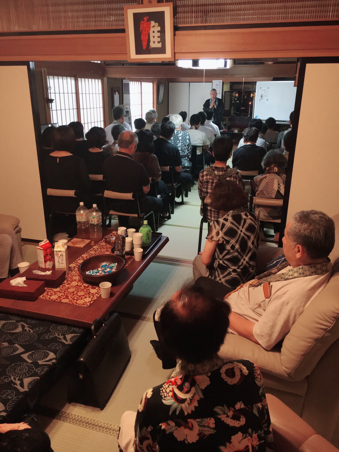 講師の法話はクーラーのある集会室でおこないました。30畳の部屋に椅子を敷き詰めなんとかみなさん入っていただけました。