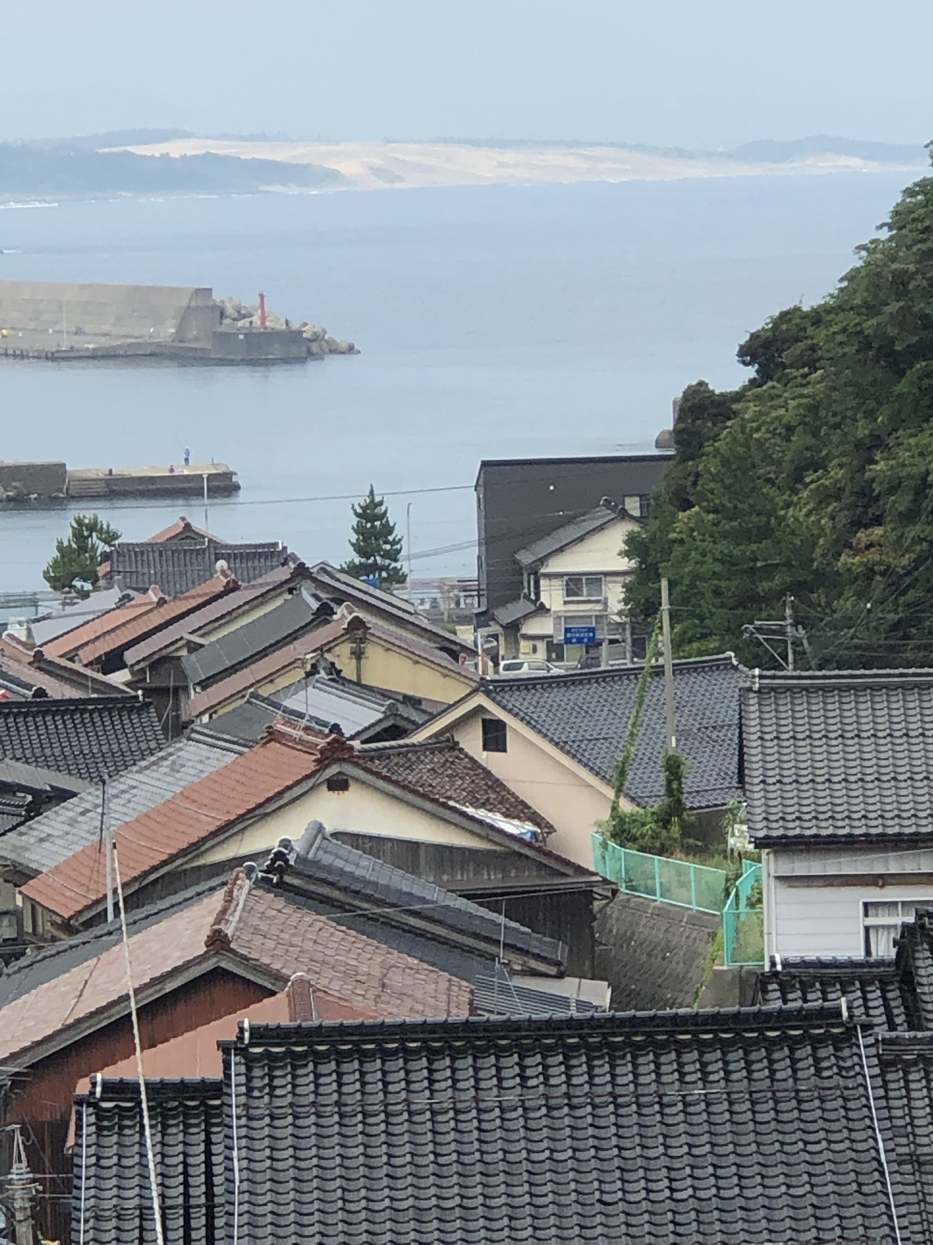 帰りがけに高台から眺めると、軒を連ねた集落と漁港、そして鳥取砂丘が一望のもとに。